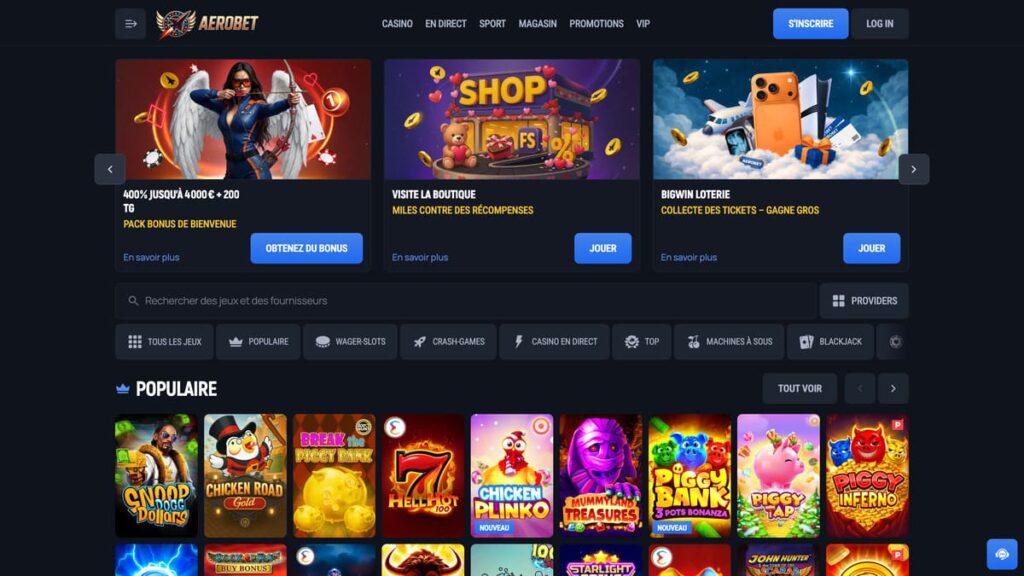 Pour les curieux qui veulent explorer, Aerobet propose des catégories bien pensées. Pas trop nombreuses, mais efficaces : populaires, wager-slots, top, nouveautés, jackpots… Ça t’aide à cibler vite et à alterner sans te noyer dans le catalogue.