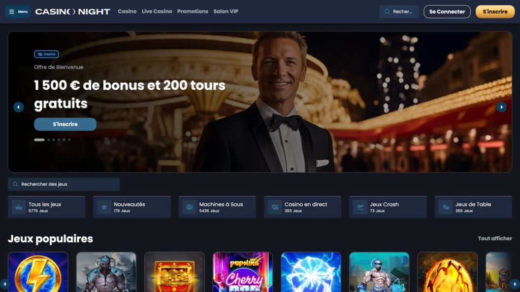 Tri possible par populaires (blackjack, roulette, TV, poker, autres) ou fournisseurs. Casino Night bosse avec des pointures comme Evolution, Amusnet et Ezugi, pour du contenu premium et quelques raretés sympas.