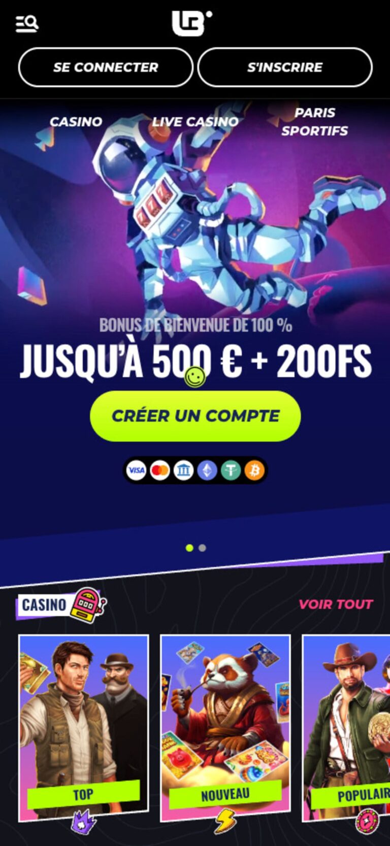 Pour le casino, tu as un bonus de 100 % jusqu’à 500 €, accompagné de 200 free spins et un bonus Crab. Dépôt minimum de 20 €, les spins distribués par paquets de 20 sur 10 jours. Les conditions sont classiques : x35 sur le bonus dépôt, x40 sur les tours gratuits.