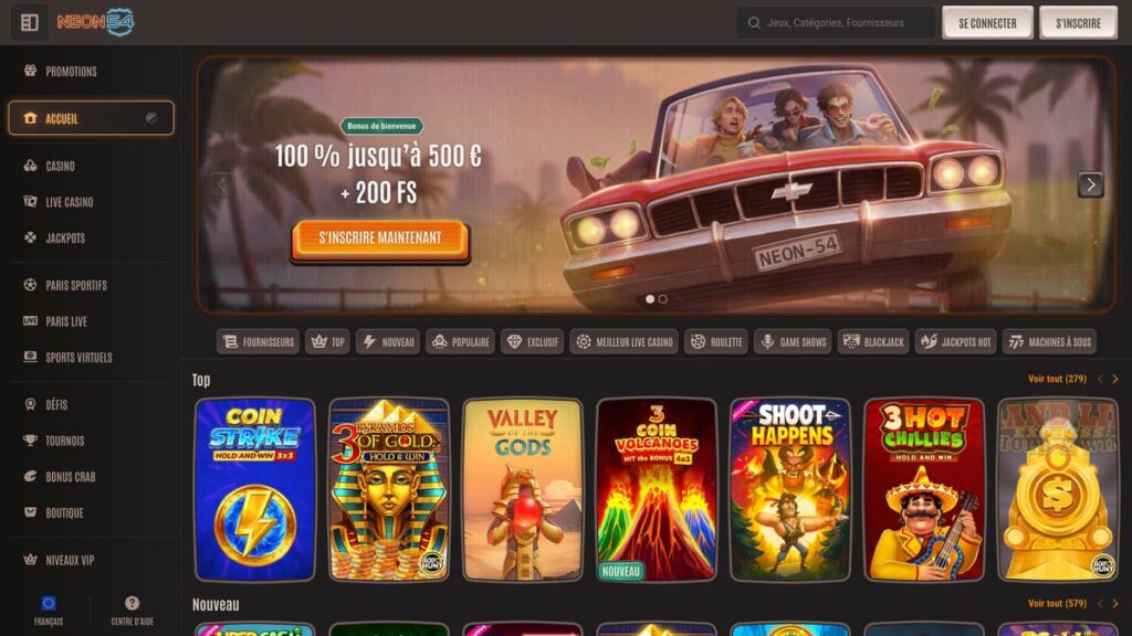 Pour jouer tranquille sur Neon54, direction la section « Casino », accessible via le bouton en haut à gauche de la page d’accueil. Tu arrives sur un lobby bien fichu qui te guide facilement vers les slots ou d’autres catégories. Super point : tous les jeux sont jouables en mode démo. Il suffit de te déconnecter, et hop, tu testes gratuitement à ton rythme ! Perso, je trouve ça parfait pour découvrir sans risque.